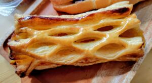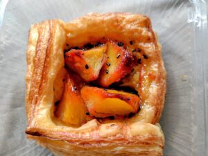 そこで、ボンシュシュも手を加えました。ボンシュシュの27層になるサックサクのデニッシュ生地の真ん中には、カスタードクリームのと甘さとねっとり感を出す大学芋をゴロゴロのせてあります。ねっとりお芋にカスタードがまとわりつくけどサックサクという素晴らしい食感なんです。冷蔵庫でしっかり冷やして食べても美味しいです。