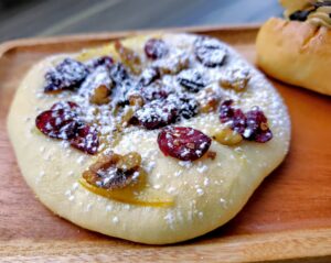 軽い食べ応えのボンシュシュの菓子パンと直感が違って、もちもち食感にオリーブオイルのスッとした爽やかさが生地全体に広がっています。その上には、女性大好きな「ドライフルーツ!!」ベリー系やアプリコット、そしてクルミものっているんです。ほんの少しのバターが溶けて粉糖がいい感じでおいしそうな景色を作っています。