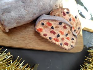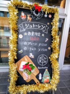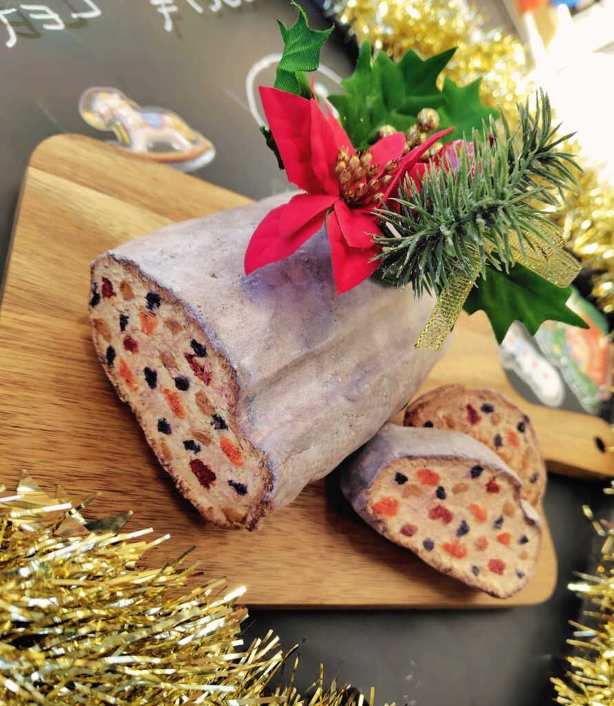 そして、利用者さまがデコレーションしてくれたイーゼル(店舗外ボード看板)がもっと映えるようにと、手先が器用な職員Y口さんが休日返上で家で紙粘土コネコネDIYして砂糖やドライフルーツの色付けまで丁寧にこだわって、フェイクのシュトーレン完成。